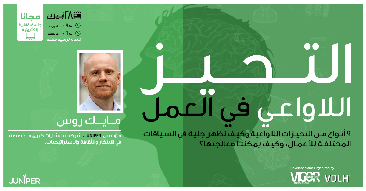 في أثناء ساعة جلسة نقاشية الكترونية دسمة تركز على الحلول، سيقدم مايك روس مختلف التحيزات اللاواعية وكيف تتجلى في مكان العمل. ستتعلم من خلال أدوات ووسائل بسيطة كيفية الكشف عنها والتخفيف من حدة آثارها وستتاح لك الفرصة لتتأمل كيف تطبق ما تعلمته في مجال عملك.
